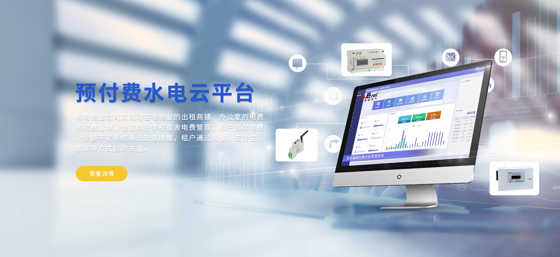 安科瑞提供的解決方案包括Acrel-EIoT能源物聯網云平臺變電所運維云平臺、安全用電管理云平臺、環保用電監管云平臺、智慧消防云平臺、能源管理云平臺、工業企業能源管控平臺、遠程預付費云平臺、餐飲油煙監管云平臺、電動汽車/電瓶車充電樁收費管理云平臺、電力監控/無線測溫系統、電能質量治理系統、電氣火災監控系統、消防設備電源監控系統防火門監控系統應急照明和疏散指示系統、智能照明控制系統、醫用隔離電源絕緣監測系統等,幫助用戶實現能源智能化、可視化、精細化管理,提高用能效率和用能安全,為企業節能降耗和實現能源數字化建設提供數據服務。